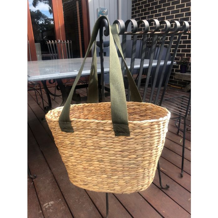 Very smart Water Hyacinth Market Basket with long green canvas handles.