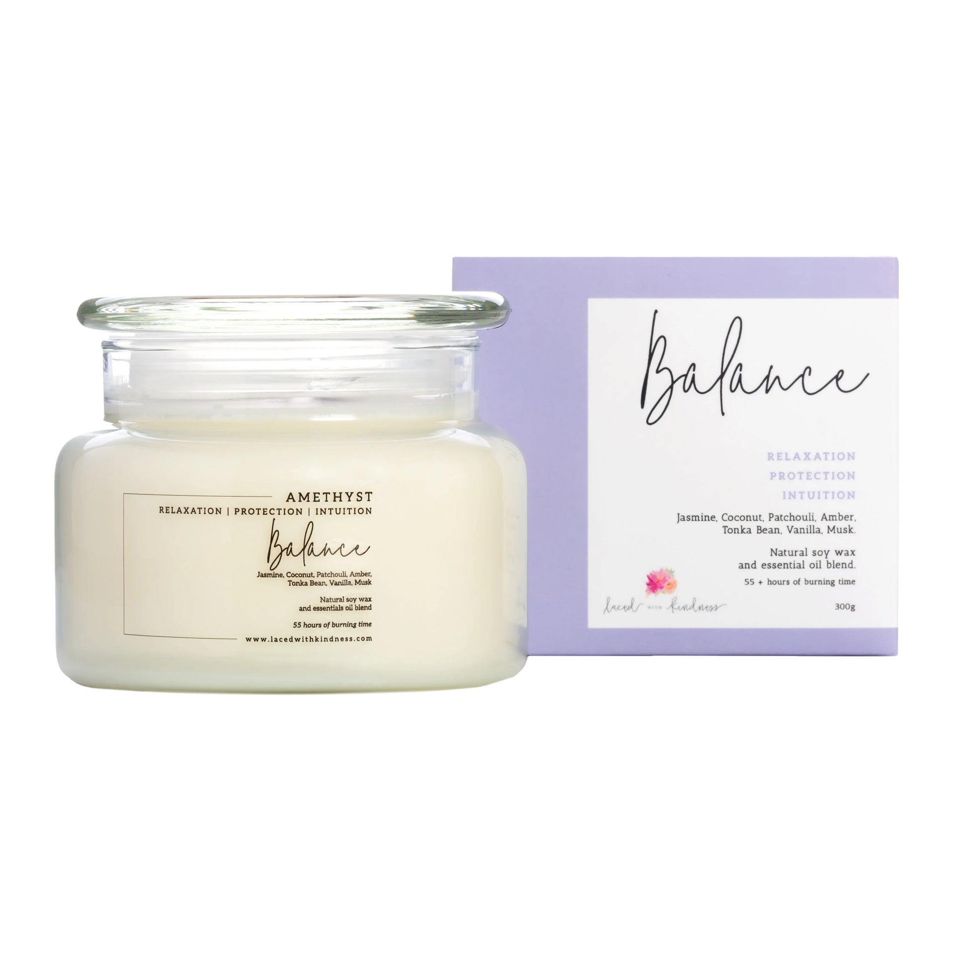 This is the perfect candle for bringing balance and harmony to any living space with its warm, sensual aroma. Topped with Amethyst crystals and wild lavender.