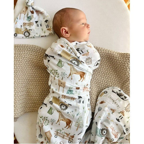 The Mini & Me Organic Jersey Baby Wrap Set Farm Life is luxuriously soft & stretchy. It comes with a matching topknot beanie , perfect for your newborns birth announcement.
